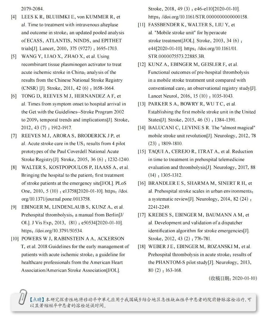 摩科特論文集│應(yīng)用移動(dòng)卒中單元對(duì)急性缺血性卒中院前靜脈溶栓的初步探索